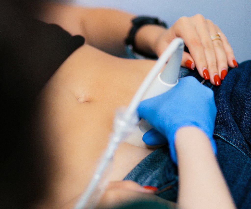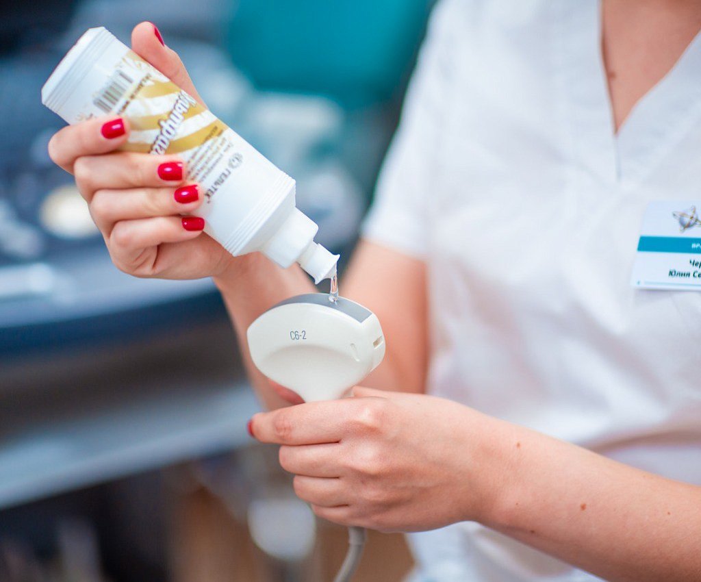 2. Врач наносит на кожу специальный гель. Он нужен для улучшения скольжения датчика и повышения проводимости ультразвуковых волн.